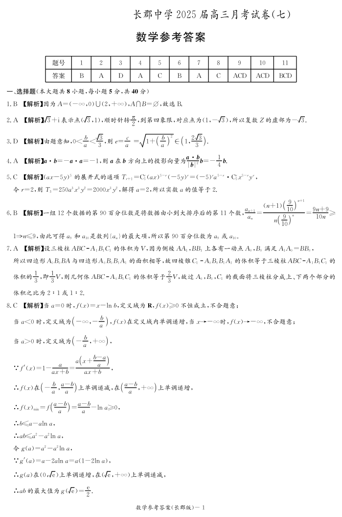 湖南省长沙市长郡中学2024- 2025 学年下学期高三月考(七)数学答案