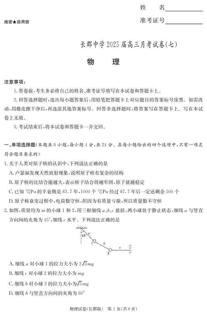 湖南省长沙市长郡中学2024- 2025 学年下学期高三月考(七)物理