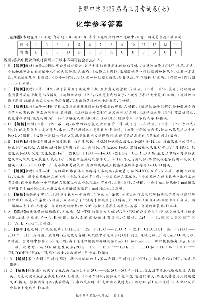 湖南省长沙市长郡中学2024- 2025 学年下学期高三月考(七)化学答案