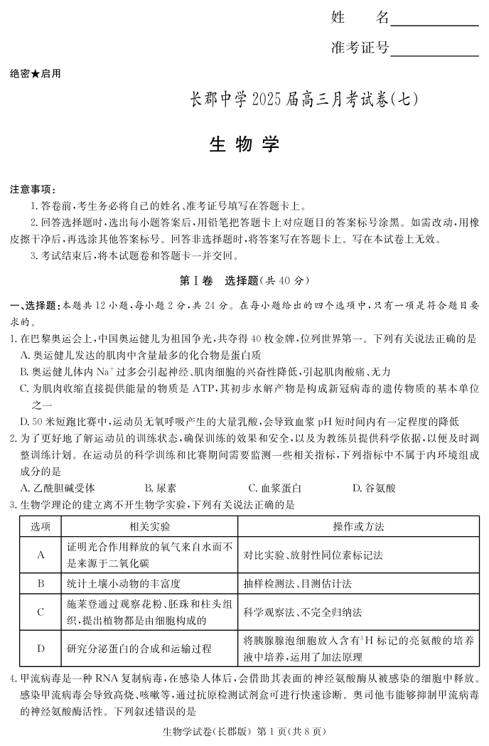 湖南省长沙市长郡中学2024- 2025 学年下学期高三月考(七)生物