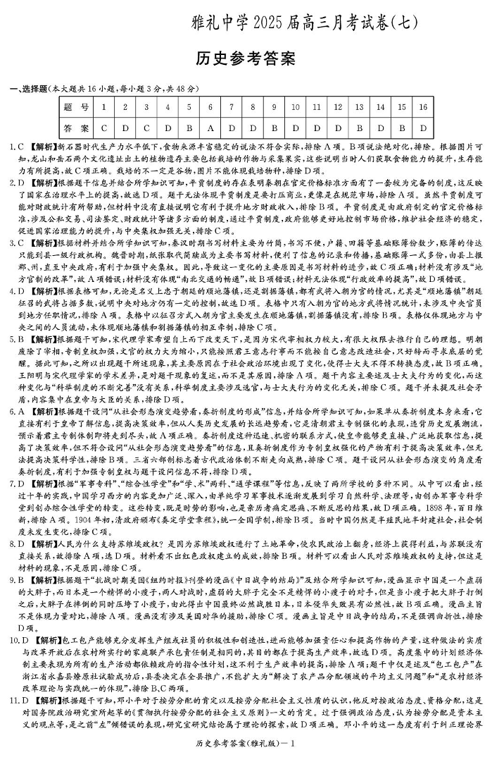 湖南省长沙市雅礼中学2024- 2025 学年下学期高三月考(七)历史答案