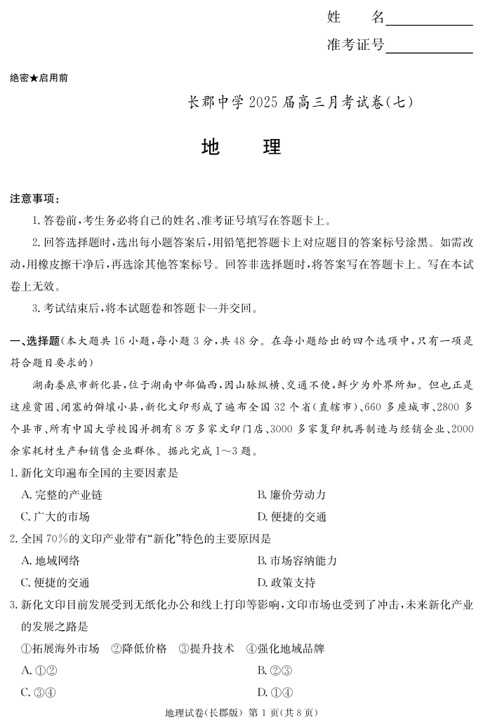 湖南省长沙市长郡中学2024- 2025 学年下学期高三月考(七)地理
