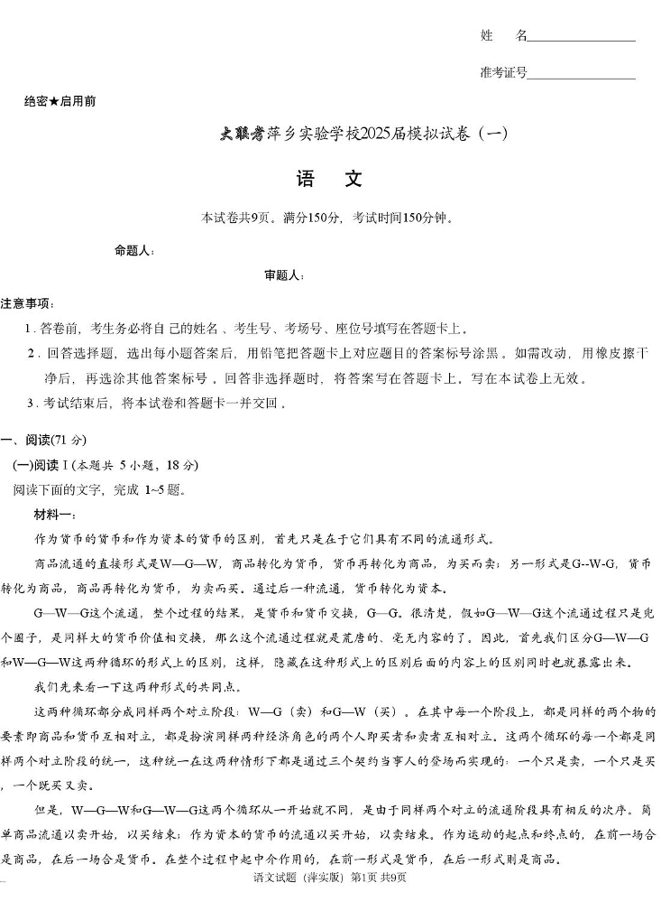 江西省萍乡实验学校2024-2025学年下学期高三模拟考试(一)语文