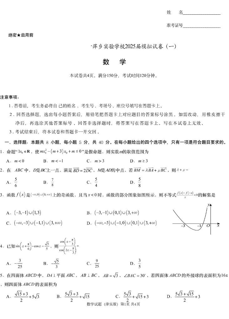 江西省萍乡实验学校2024-2025学年下学期高三模拟考试(一)数学