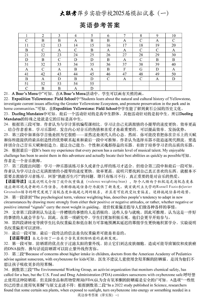 江西省萍乡实验学校2024-2025学年下学期高三模拟考试(一)英语答案