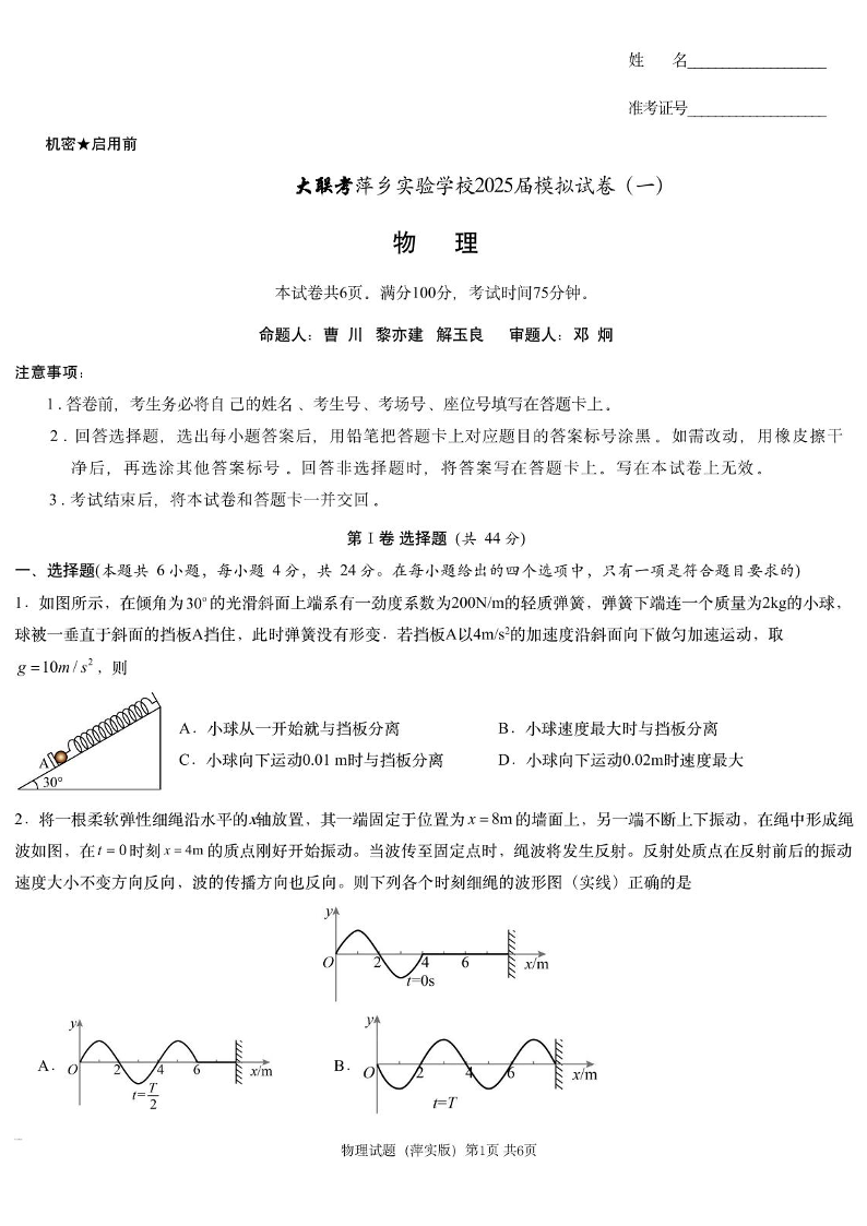 江西省萍乡实验学校2024-2025学年下学期高三模拟考试(一)物理+答案