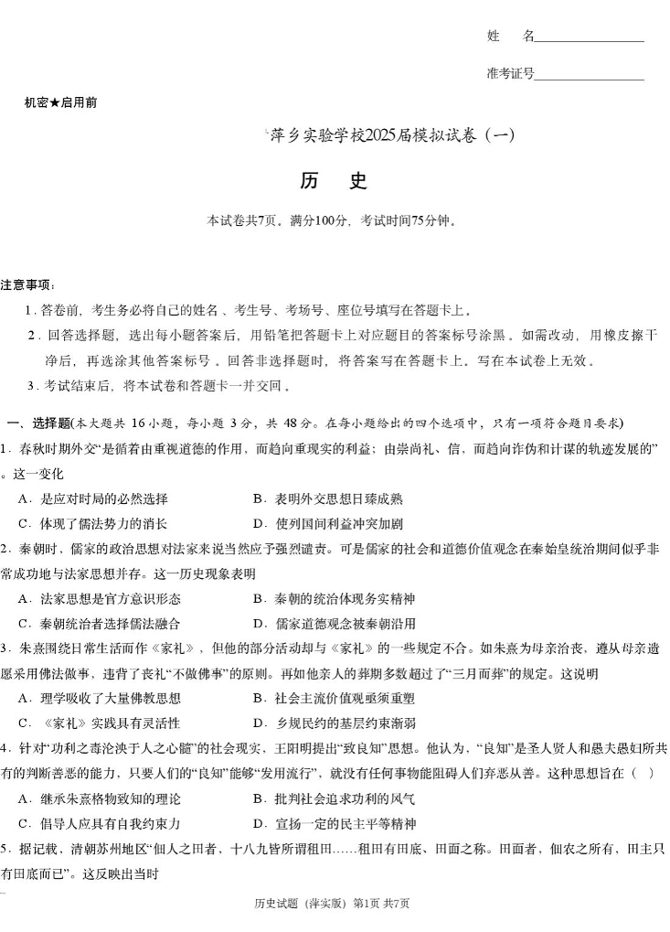 江西省萍乡实验学校2024-2025学年下学期高三模拟考试(一)历史