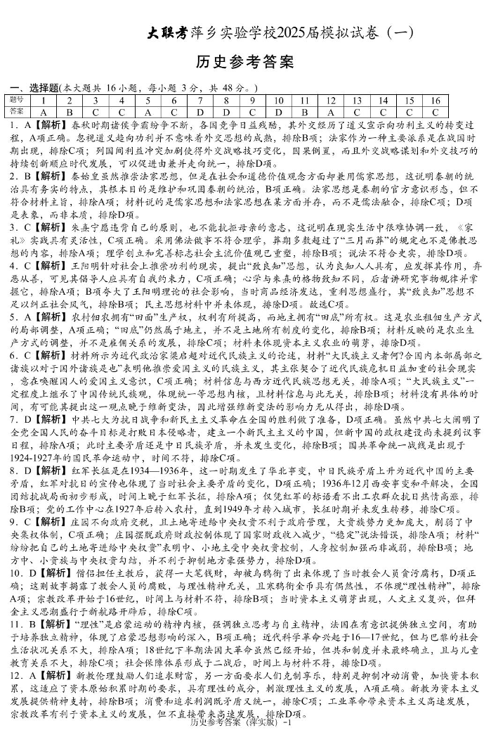 江西省萍乡实验学校2024-2025学年下学期高三模拟考试(一)历史答案