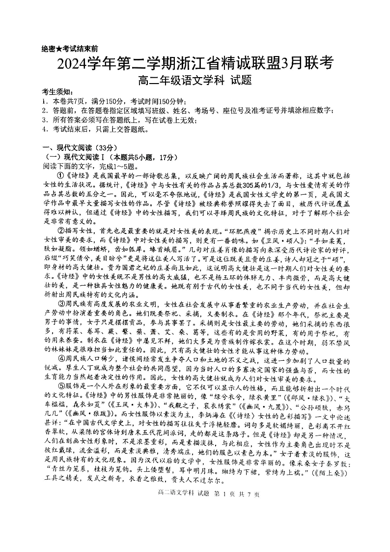 浙江省精诚联盟2024-2025学年下学期3月高二月考语文