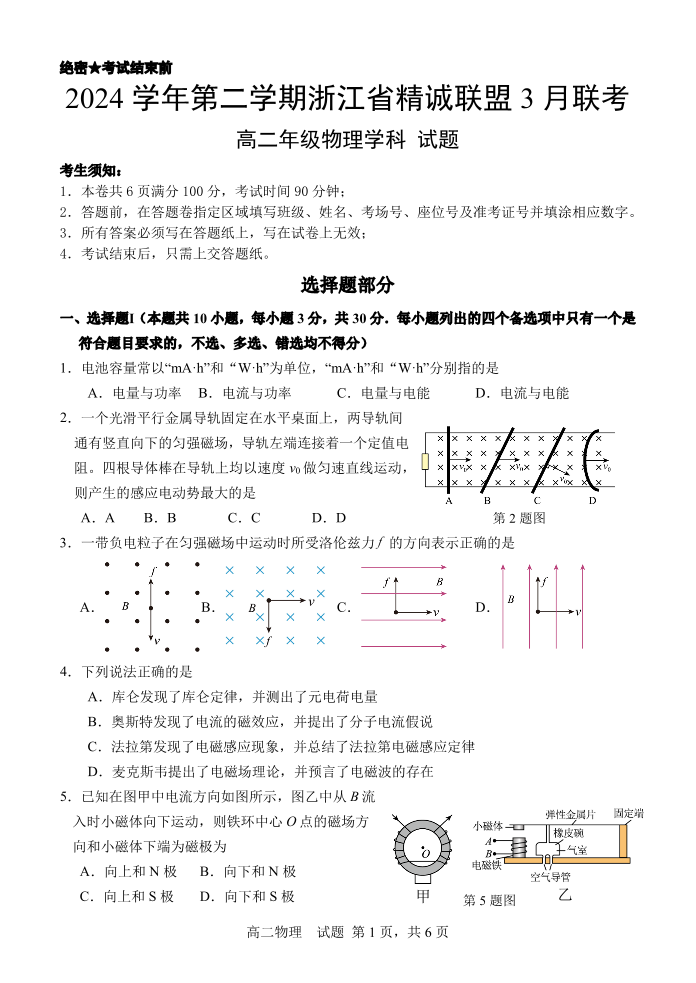 浙江省精诚联盟2024-2025学年下学期3月高二月考物理