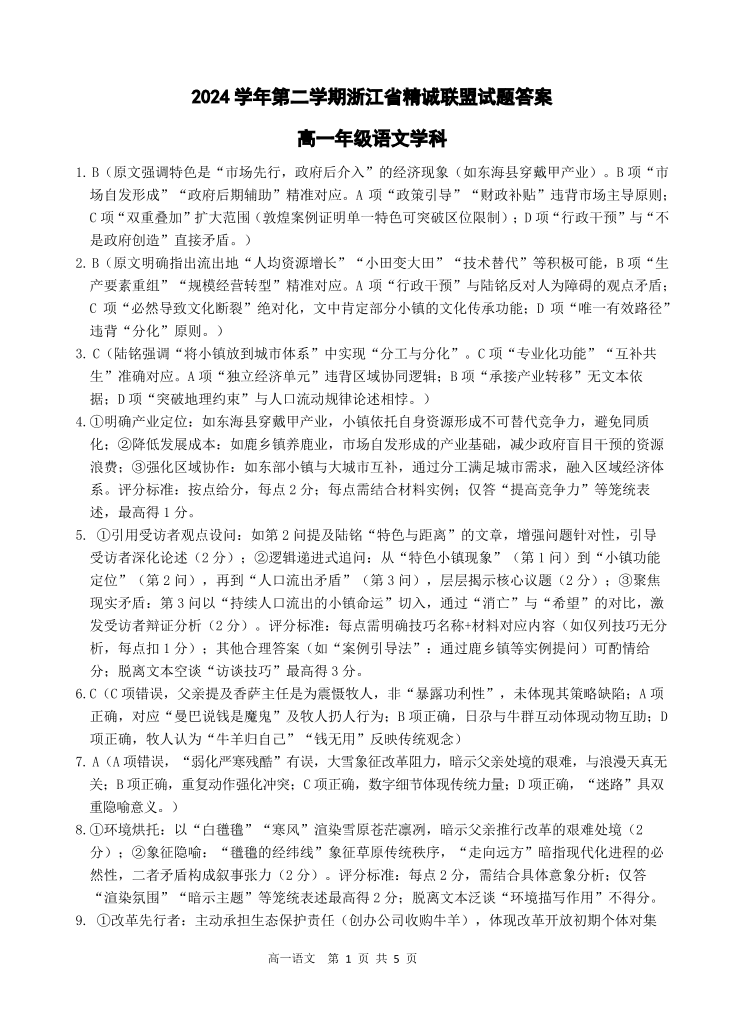 浙江省精诚联盟2024-2025学年下学期3月高一月考语文答案