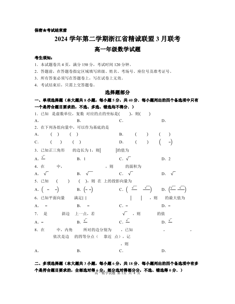 浙江省精诚联盟2024-2025学年下学期3月高一月考数学