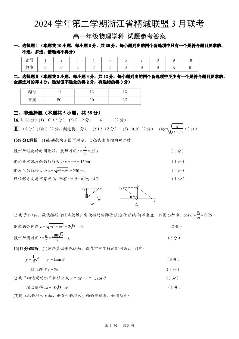 浙江省精诚联盟2024-2025学年下学期3月高一月考物理答案