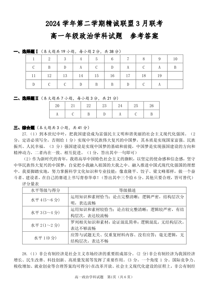浙江省精诚联盟2024-2025学年下学期3月高一月考政治答案