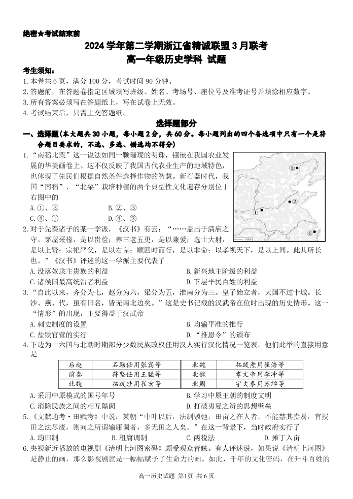 浙江省精诚联盟2024-2025学年下学期3月高一月考历史