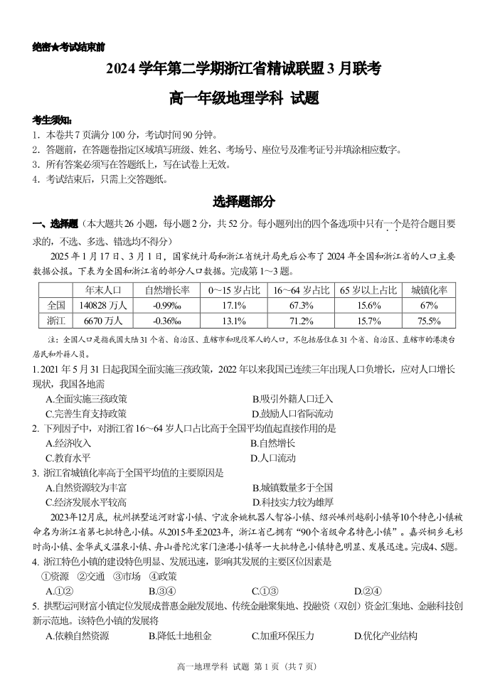 浙江省精诚联盟2024-2025学年下学期3月高一月考地理