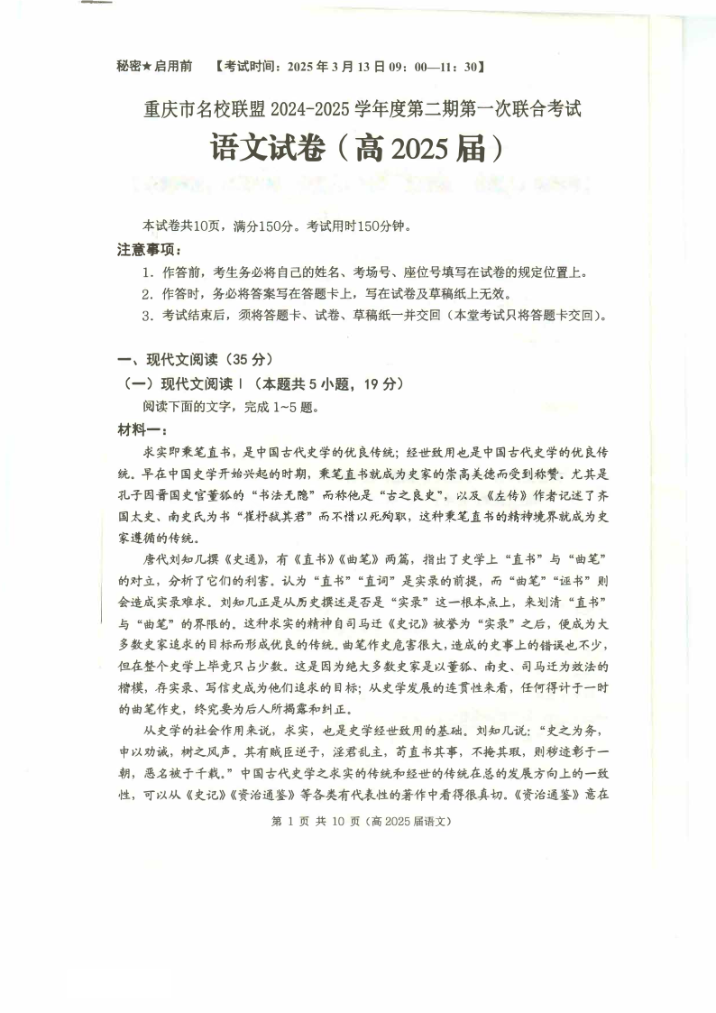 重庆市名校联盟2024-2025学年下学期高三第一次考试语文