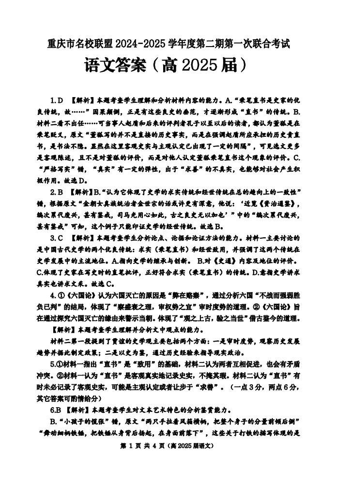 重庆市名校联盟2024-2025学年下学期高三第一次考试语文答案