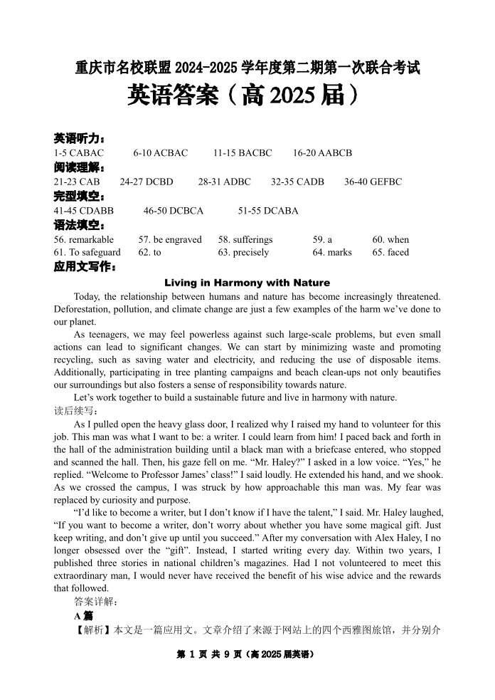 重庆市名校联盟2024-2025学年下学期高三第一次考试英语答案