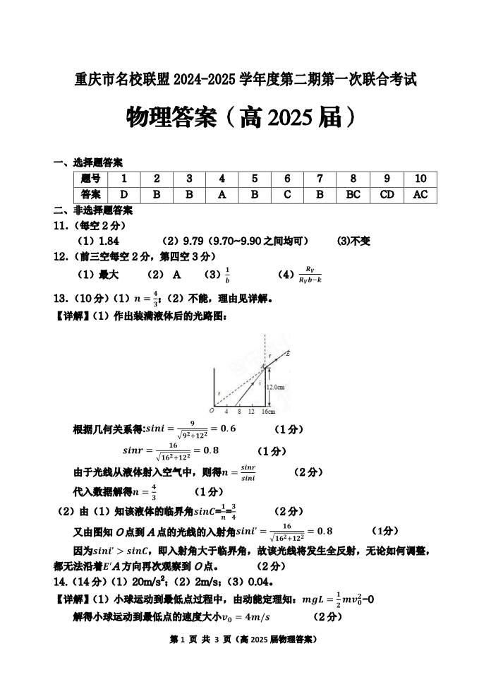 重庆市名校联盟2024-2025学年下学期高三第一次考试物理答案