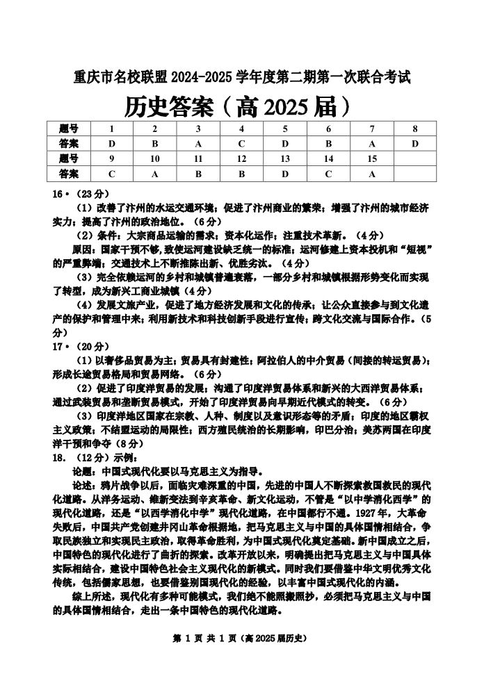 重庆市名校联盟2024-2025学年下学期高三第一次考试历史答案