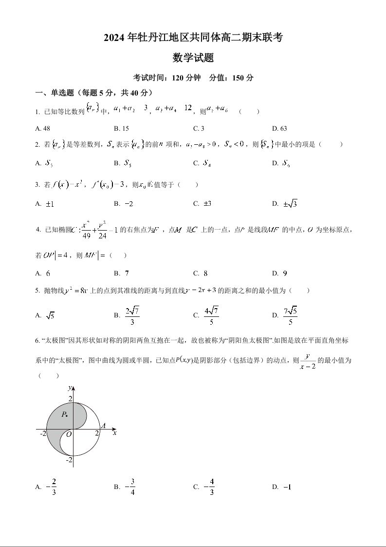 黑龙江省牡丹江地区2024-2025学年上学期1月高二期末考试数学(原卷版)