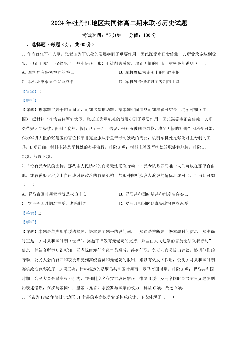 黑龙江省牡丹江地区2024-2025学年上学期1月高二期末考试历史(解析版)