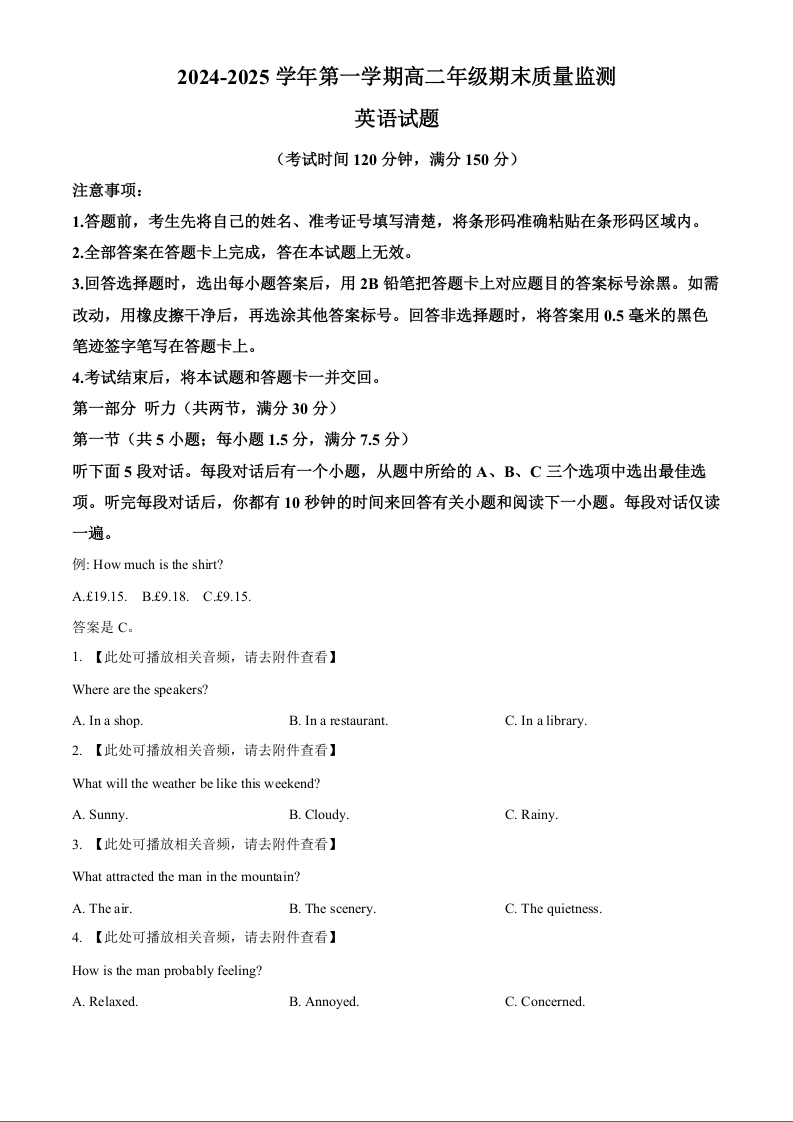 山西省阳泉市2024-2025学年上学期1月高二期末考试英语(原卷版)