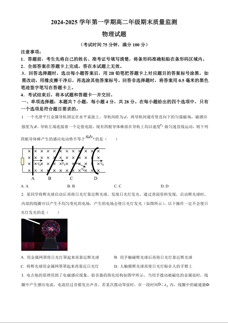 山西省阳泉市2024-2025学年上学期1月高二期末考试物理+答案