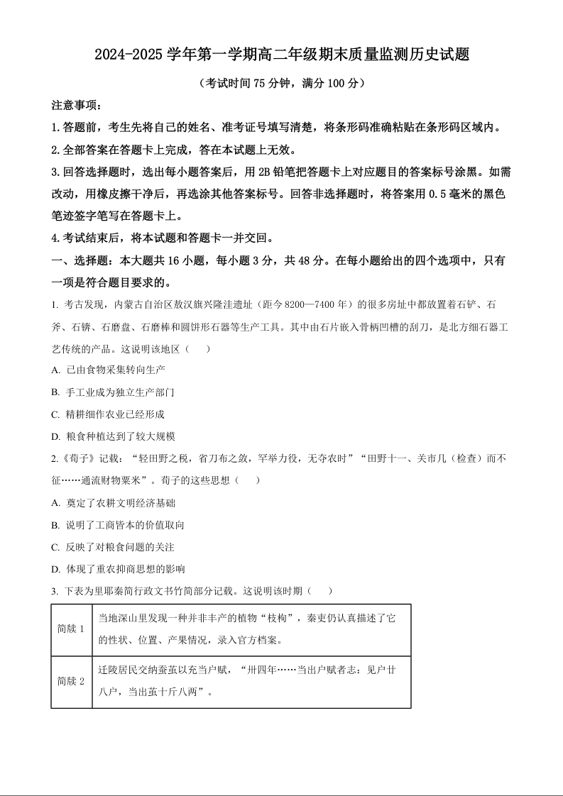 山西省阳泉市2024-2025学年上学期1月高二期末考试历史(原卷版)