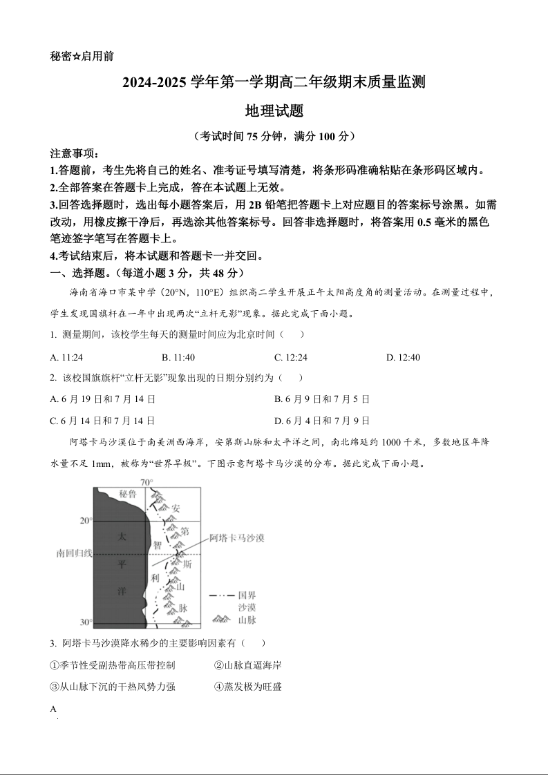 山西省阳泉市2024-2025学年上学期1月高二期末考试地理(原卷版)