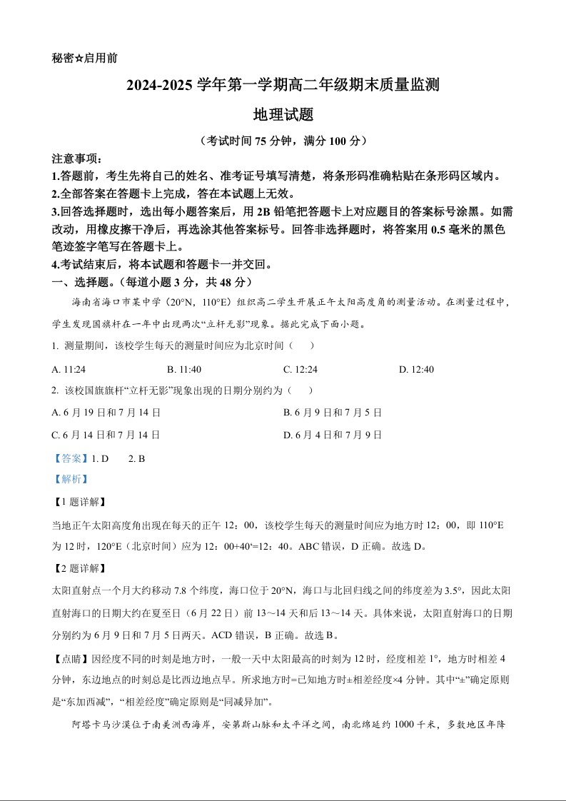 山西省阳泉市2024-2025学年上学期1月高二期末考试地理(解析版)