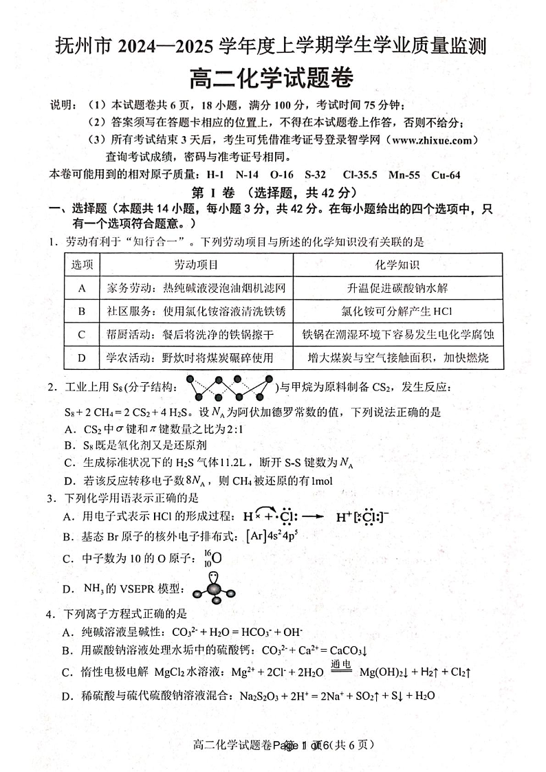 江西省抚州市2024-2025学年上学期1育人高二期末考试化学