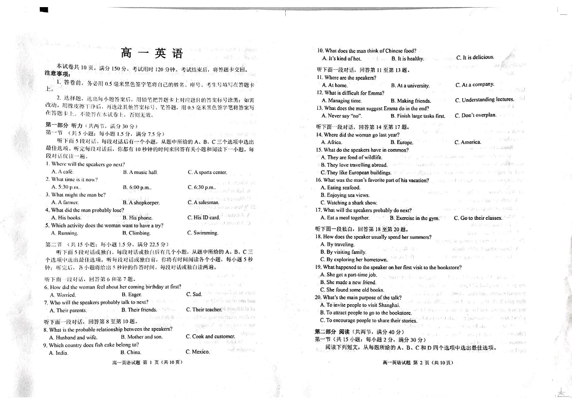 山东省威海市2024-2025学年上学期1月高一期末考试英语