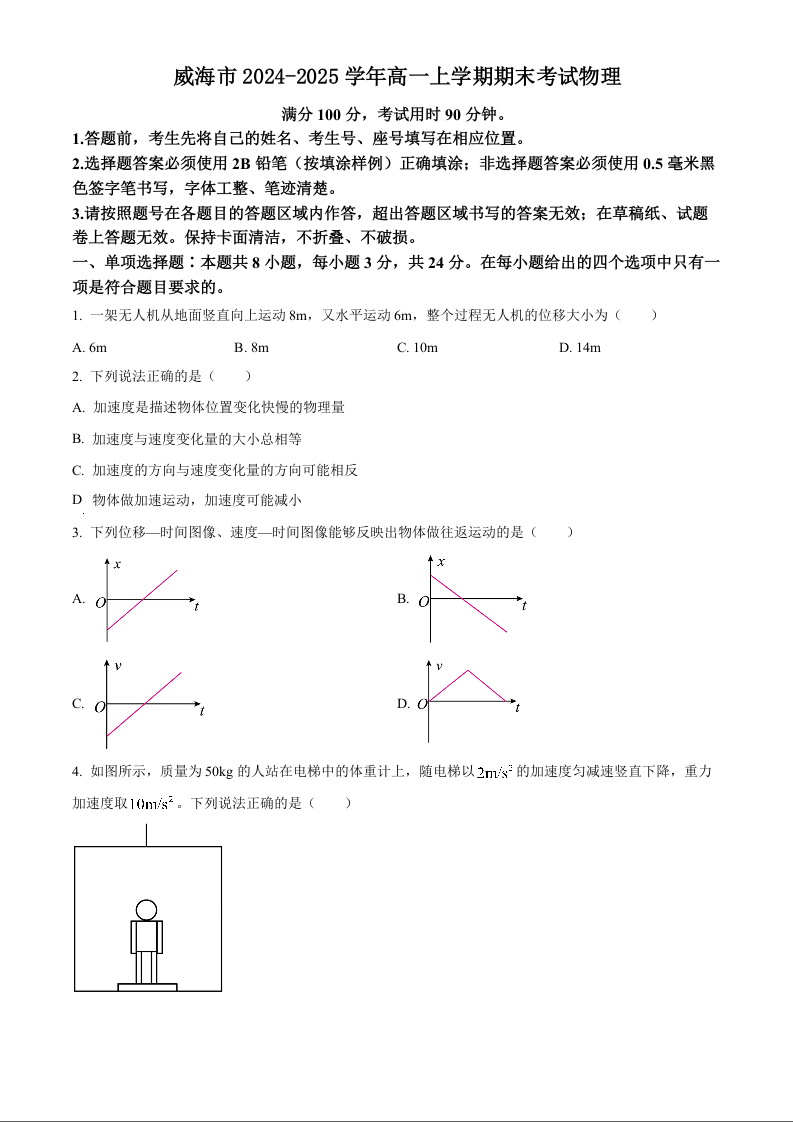 山东省威海市2024-2025学年上学期1月高一期末考试物理+答案