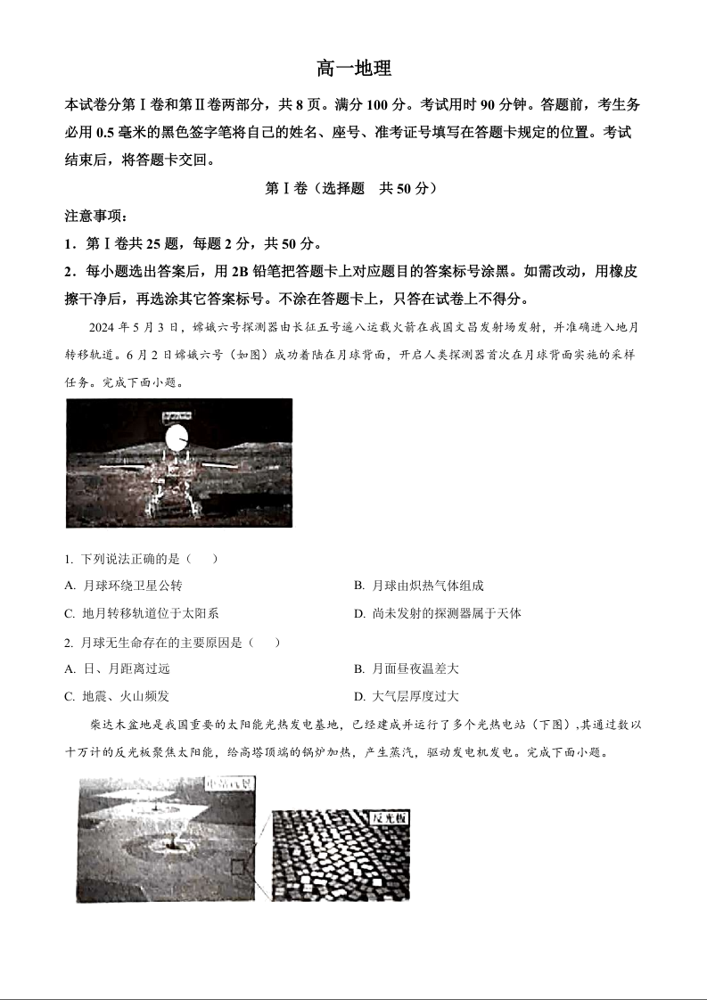 山东省威海市2024-2025学年上学期1月高一期末考试地理(原卷版)