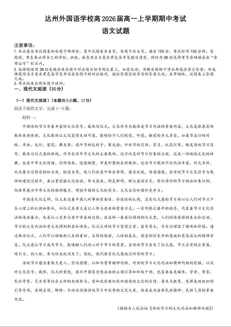 四川省达州外国语学校2023-2024学年高一上学期期中考试语文