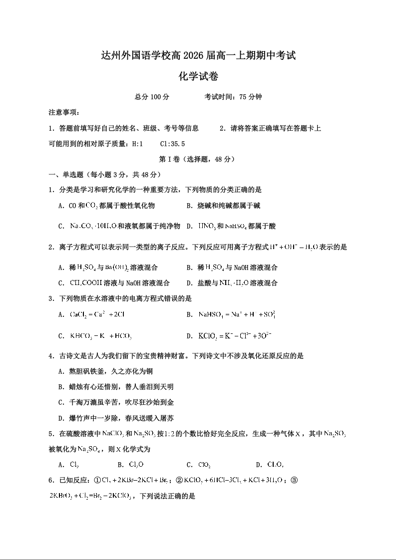 四川省达州外国语学校2023-2024学年高一上学期期中考试化学