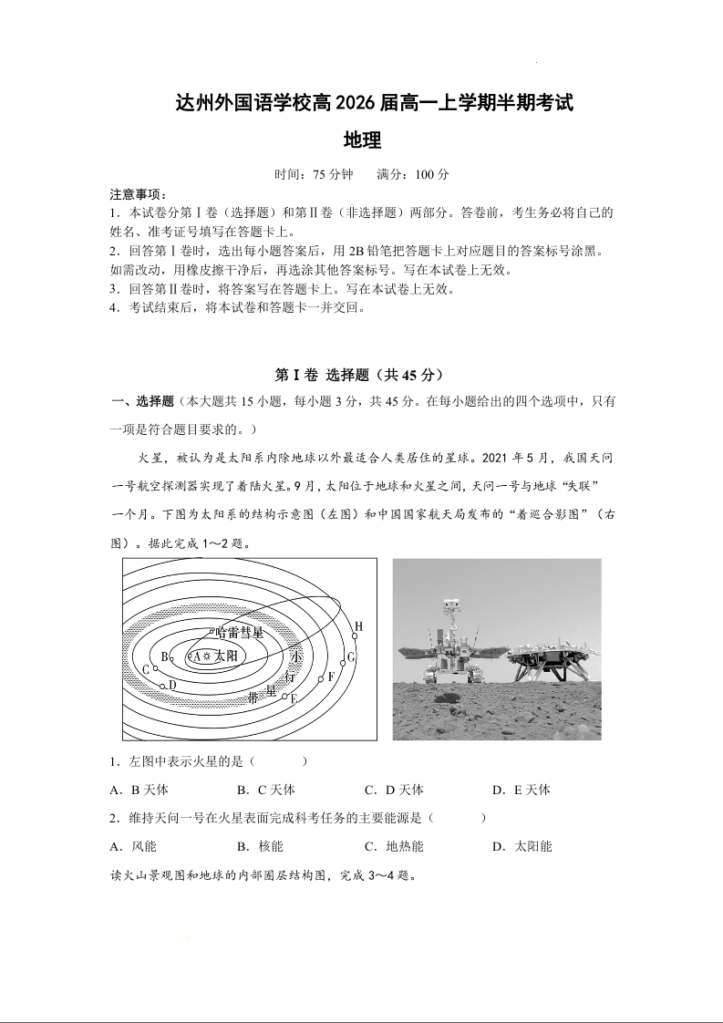 四川省达州外国语学校2023-2024学年高一上学期期中考试地理