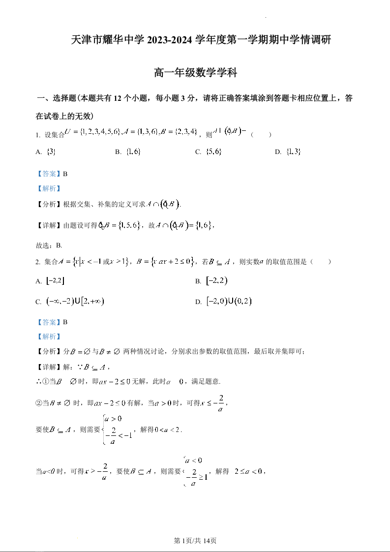 天津市耀华中学2023-2024学年高一上学期11月期中考试数学(精品解析版)