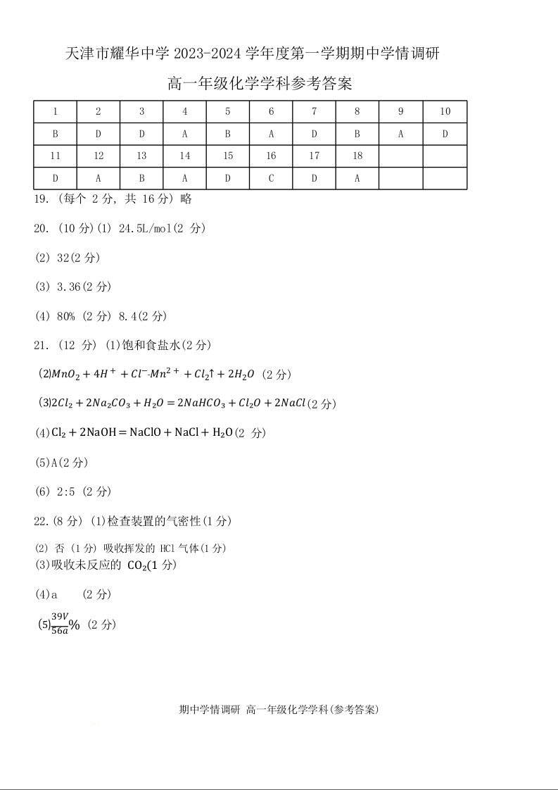 天津市耀华中学2023-2024学年高一上学期11月期中考试化学答案