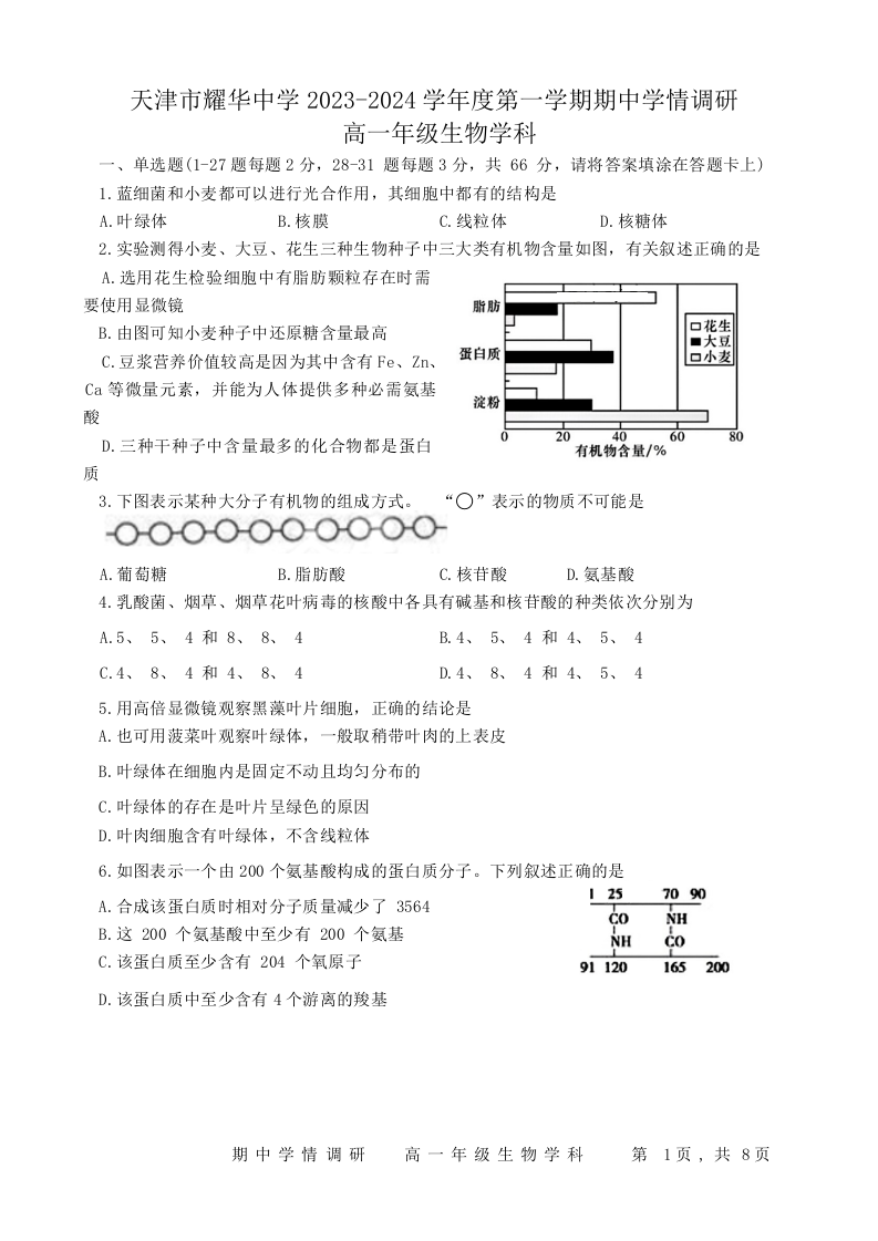 天津市耀华中学2023-2024学年高一上学期11月期中考试生物