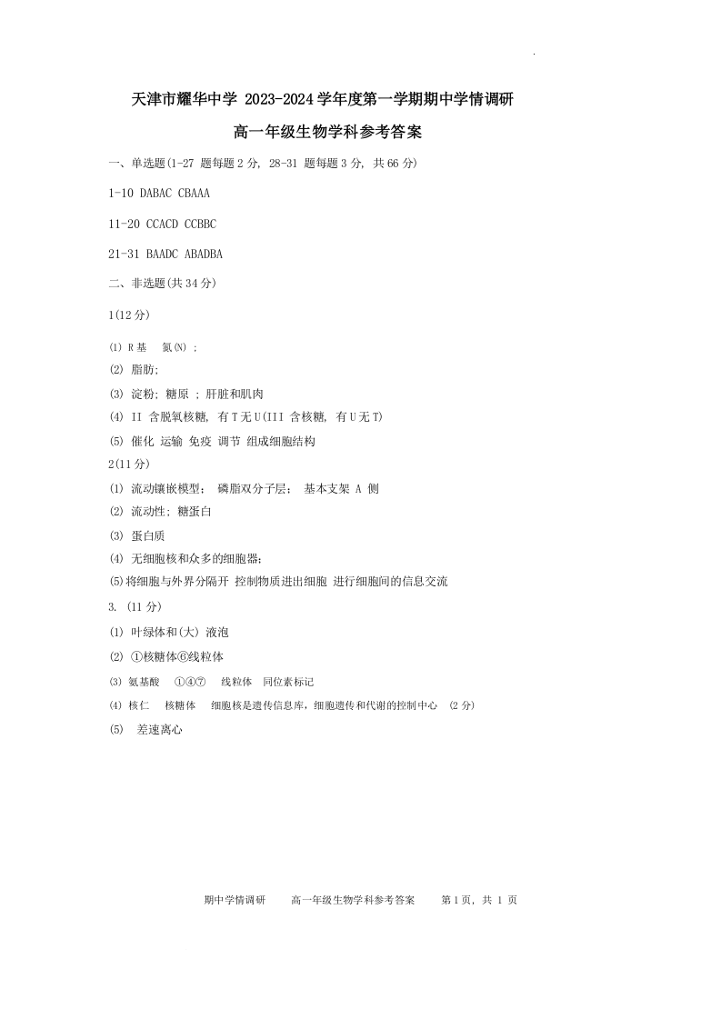 天津市耀华中学2023-2024学年高一上学期11月期中考试生物答案