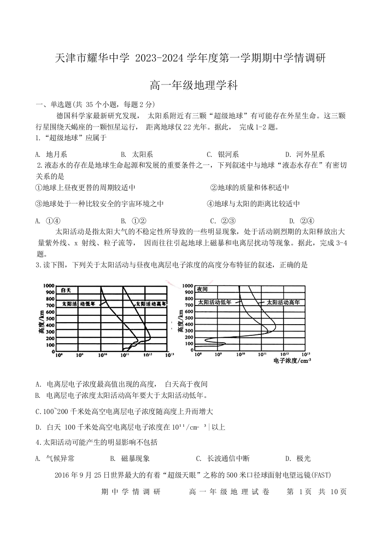 天津市耀华中学2023-2024学年高一上学期11月期中考试地理