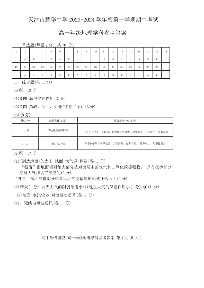 天津市耀华中学2023-2024学年高一上学期11月期中考试地理答案