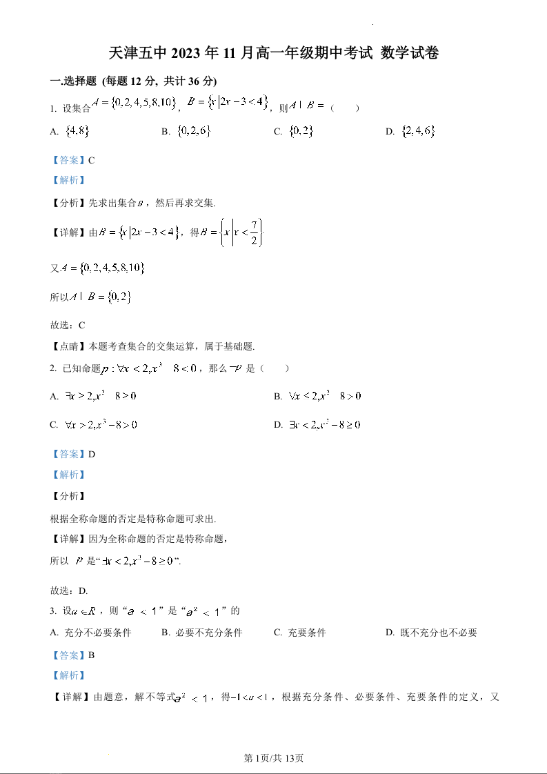 天津市红桥区2023-2024学年高一上学期11月期中考试数学(精品解析版)