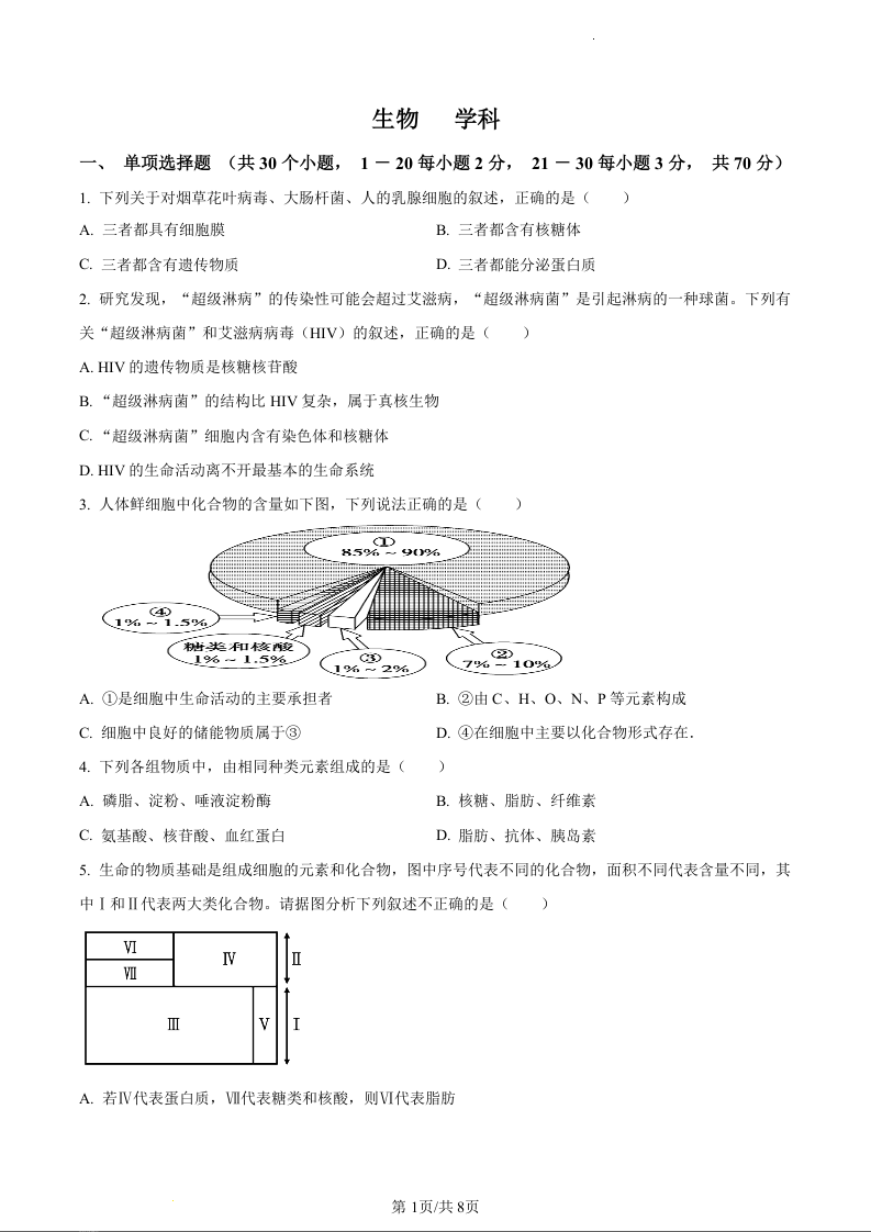 天津市红桥区2023-2024学年高一上学期11月期中考试生物(原卷版)