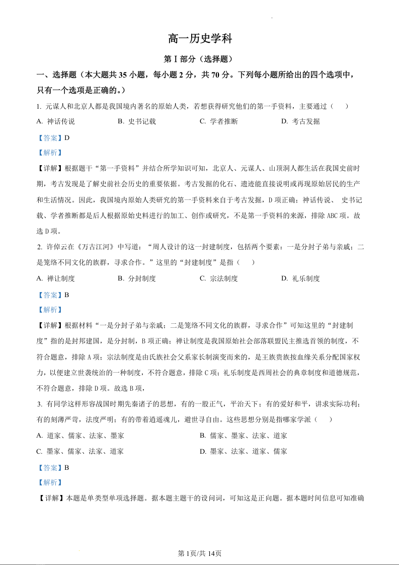 天津市红桥区2023-2024学年高一上学期11月期中考试历史(精品解析版)
