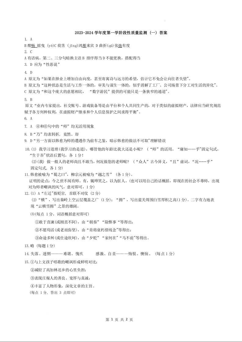天津市南开区2023-2024学年高一上学期11月期中考试语文答案
