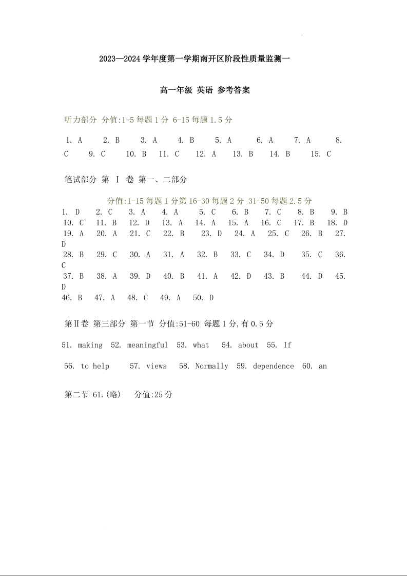 天津市南开区2023-2024学年高一上学期11月期中考试英语答案